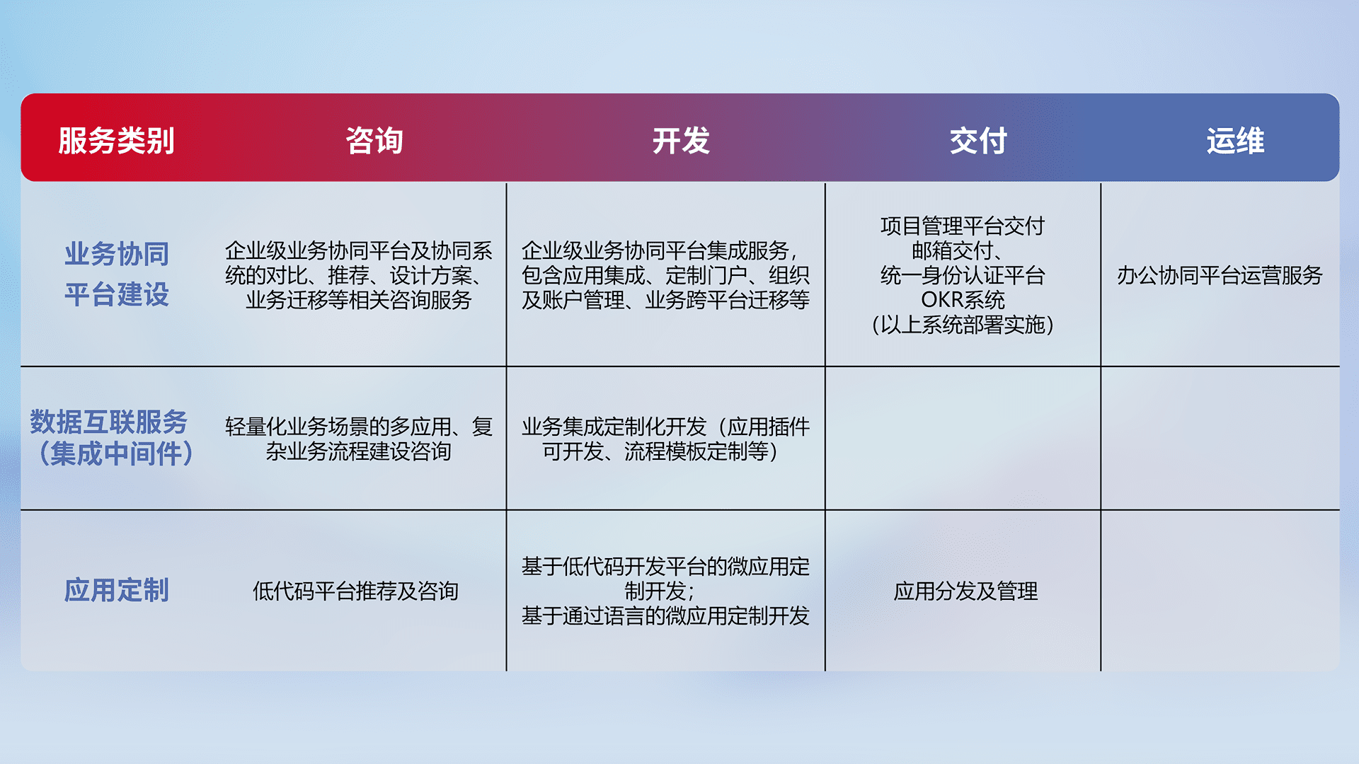 针对钉钉、、、、企微、、、IDaas等平台级产品提供产品的规划、、方案、、、、交付、、定制化开发等服务,,,实现如统一协同办公、、、智能客户服务、、混合会议管理、、智能数据查询、、、等业务场景,,实现数字化转型。。。