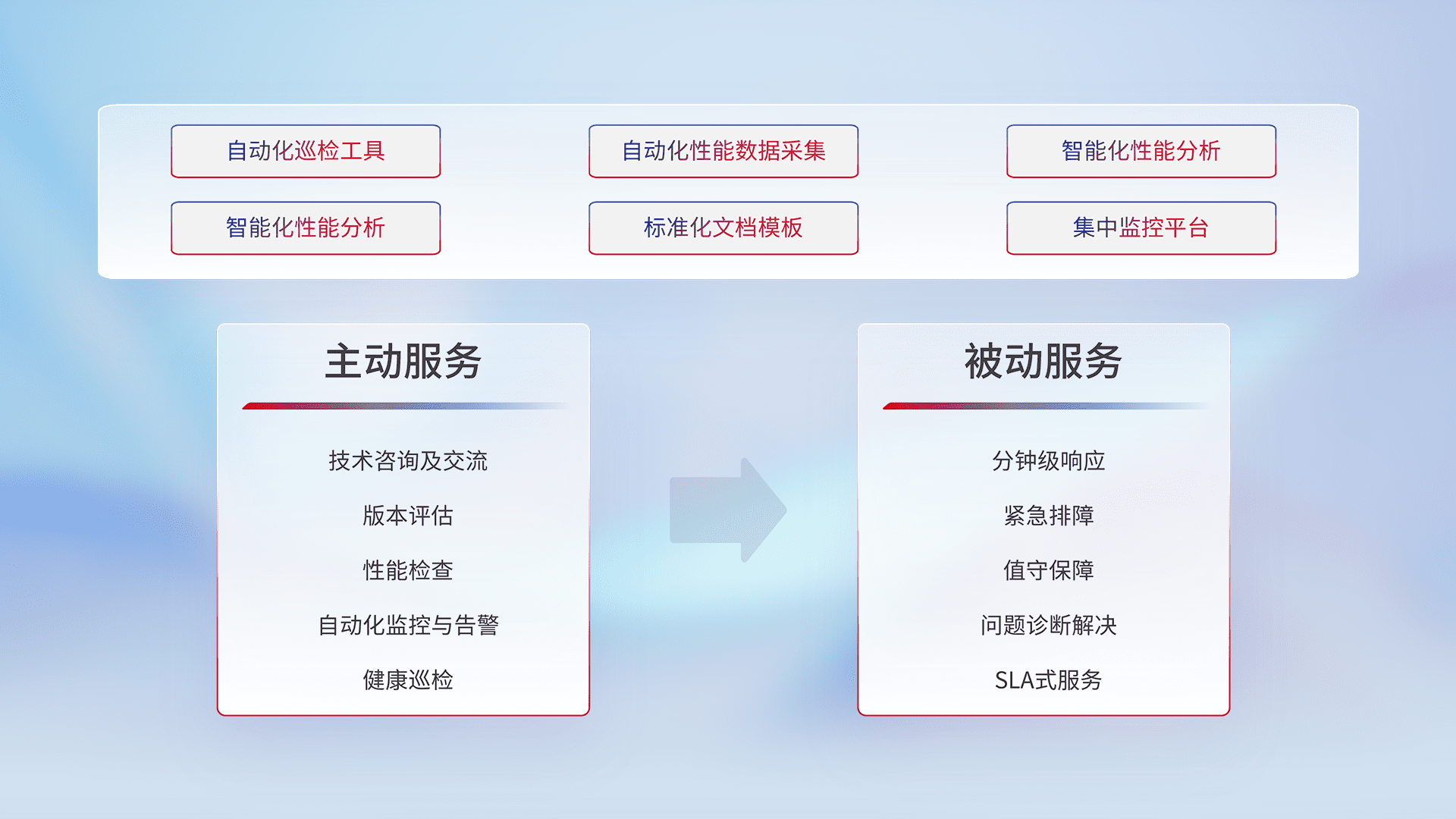 智能化工具和标准化文档,,保障服务质量,,,,提供主动服务(包含技术咨询、、版本评估、、性能检查、、自动化监控与告警、、健康巡检)和被动服务包含(分钟级响应、、、、紧急排障、、、值守保障、、问题诊断解决、、SLA服务)。。。